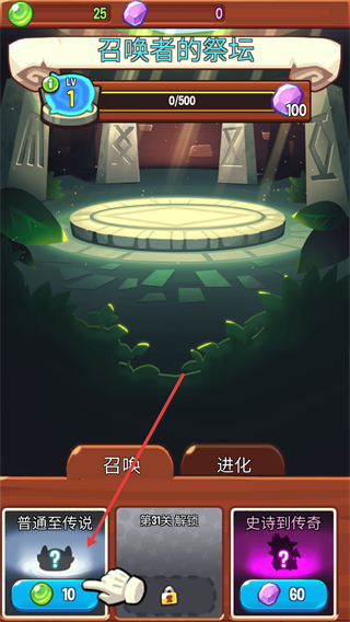 2、在祭壇頁(yè)面點(diǎn)擊【普通至傳說(shuō)】召喚選項(xiàng),消耗10個(gè)綠色資源進(jìn)行召喚。