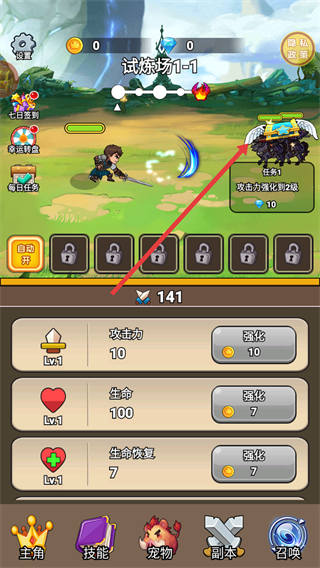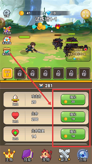 3、使用金幣強(qiáng)化攻擊力、生命、生命恢復(fù)等屬性,提升角色戰(zhàn)力。