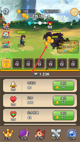 4、持續(xù)戰(zhàn)斗與強(qiáng)化,推進(jìn)至更高關(guān)卡如試煉場(chǎng)1-5,獲取更多金幣和獎(jiǎng)勵(lì)。
