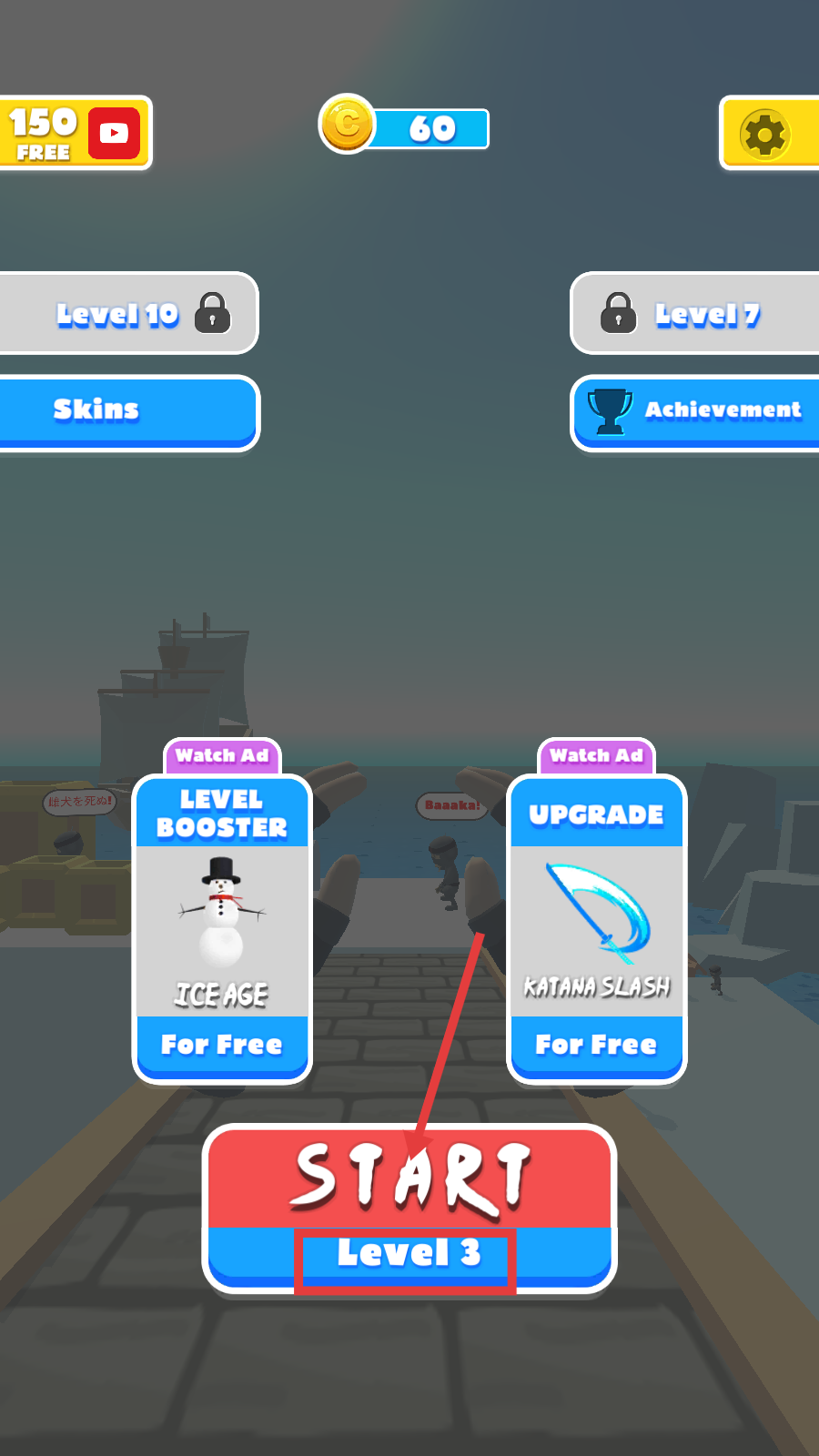 1、點擊【START-Level3】開始游戲,可查看【Skins】【Achievement】功能,積累金幣提升游戲進度。