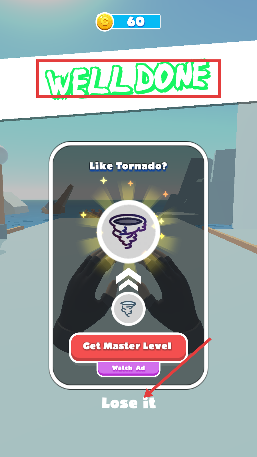 4、通關(guān)后出現(xiàn)【W(wǎng)ELLDONE】提示,可選擇【GetMasterLevel】或【Loseit】,合理選擇以推進游戲進程。