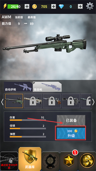 4、消耗金幣升級(jí)武器,提升傷害、倍鏡和彈匣等屬性,增強(qiáng)戰(zhàn)力,應(yīng)對(duì)更高難度關(guān)卡。