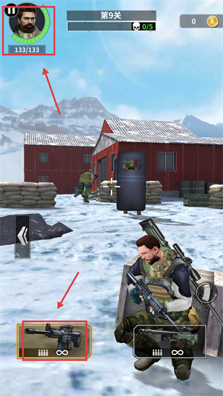 1、角色血量是無敵的,選擇合適武器作戰(zhàn),確保自身生存,順利推進(jìn)第9關(guān)。