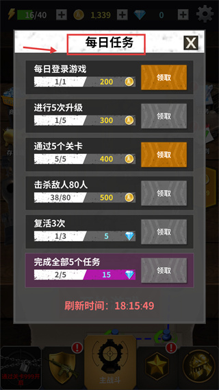 4、完成每日任務(wù),領(lǐng)取金幣和鉆石獎勵,積累資源用于升級武器和解鎖內(nèi)容,助力游戲進(jìn)程。