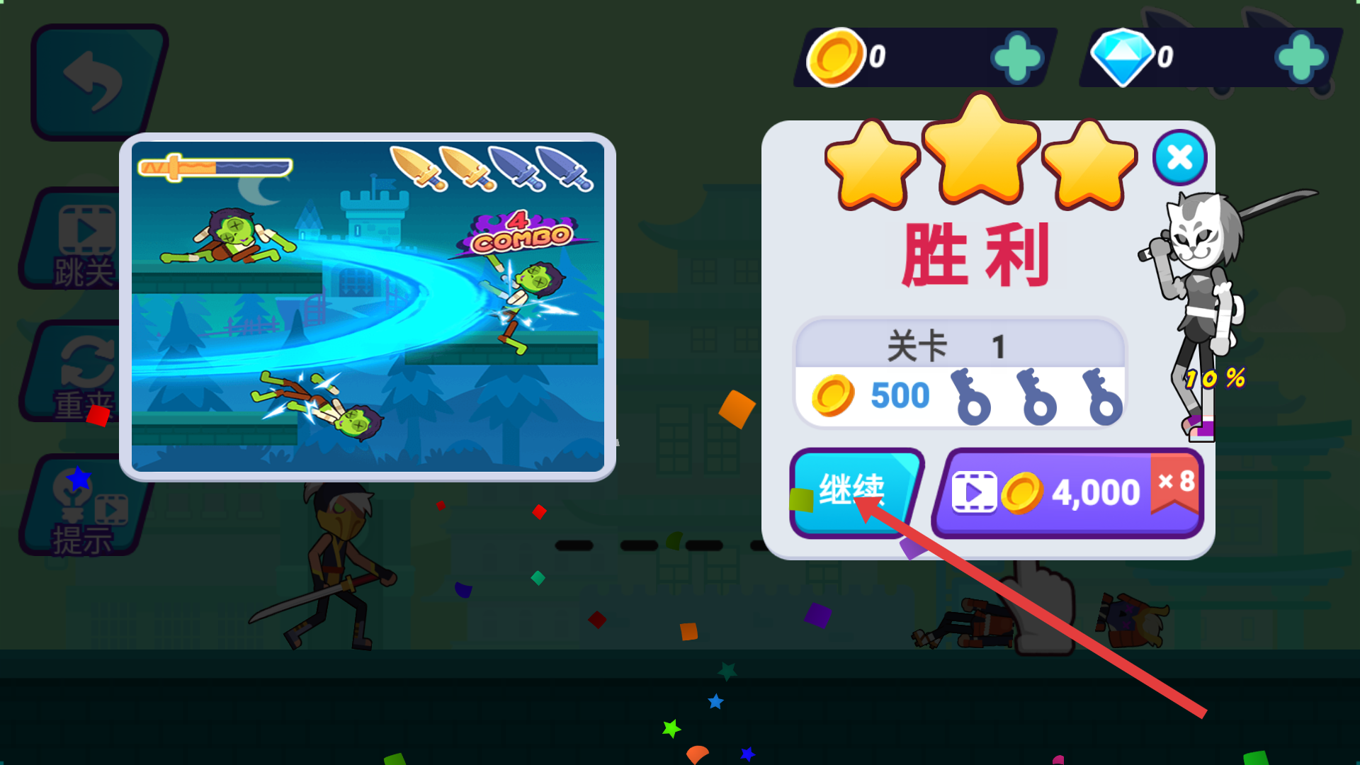 4、完成關(guān)卡1的戰(zhàn)斗并獲得勝利后,點擊【繼續(xù)】按鈕,進入下一個關(guān)卡繼續(xù)游戲。