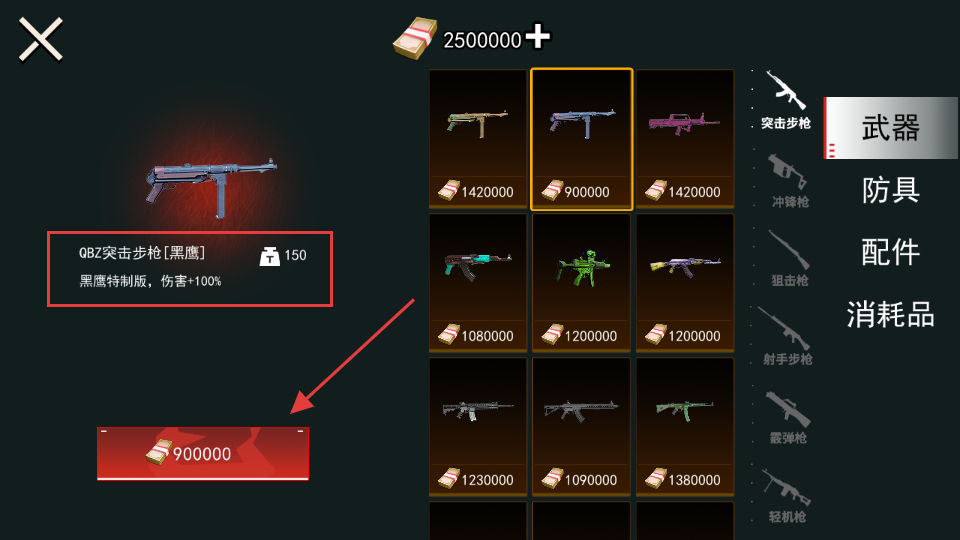 1、在武器界面,用900000【QBZ突擊步槍[黑鷹]】,可購買并裝備提升傷害。