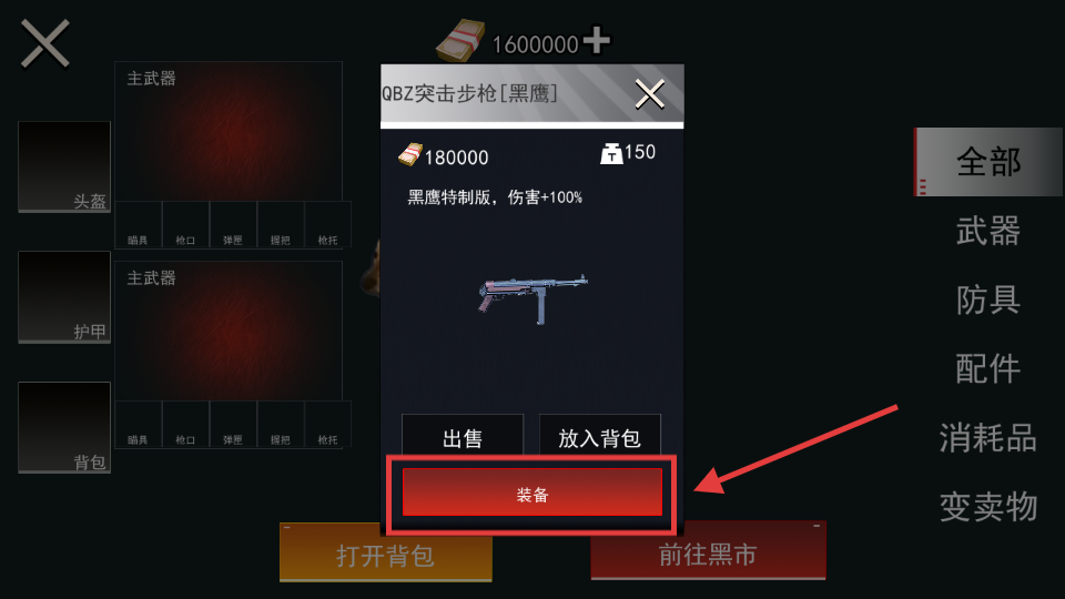 2、點擊【QBZ突擊步槍[黑鷹]】后,選擇裝備,將其放入背包便于隨時使用。