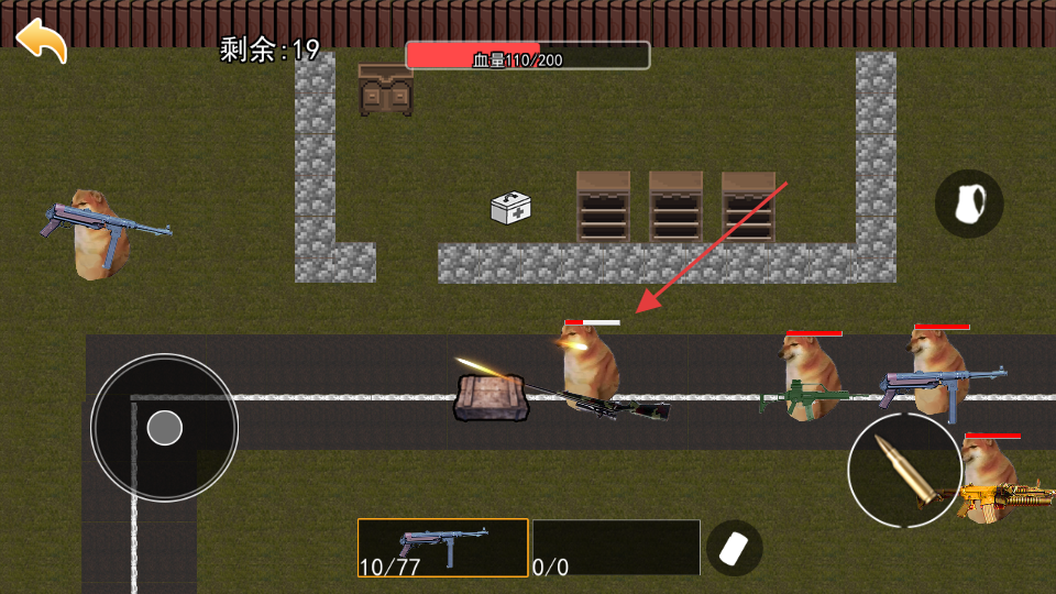 3、戰(zhàn)斗中,靈活走位射擊修勾敵人,利用障礙物躲避傷害,獲取武器。