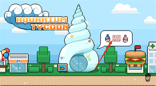 1、進入游戲時,在主界面找到【GAME-START】選項并點擊,即可開啟【AQUARIUM-TYCOON】的水族館經營之旅。