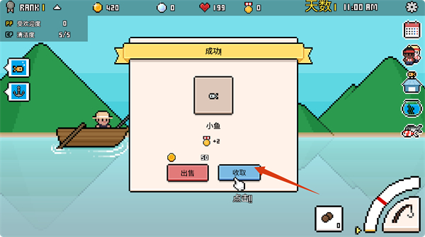 4、釣到魚后,出現(xiàn)“成功”提示框時,點擊【收取】按鈕,可將小魚收入囊中,用于后續(xù)水族館經營。