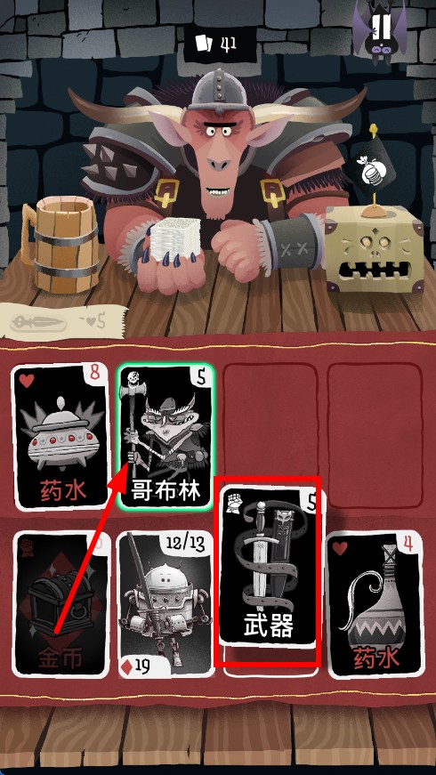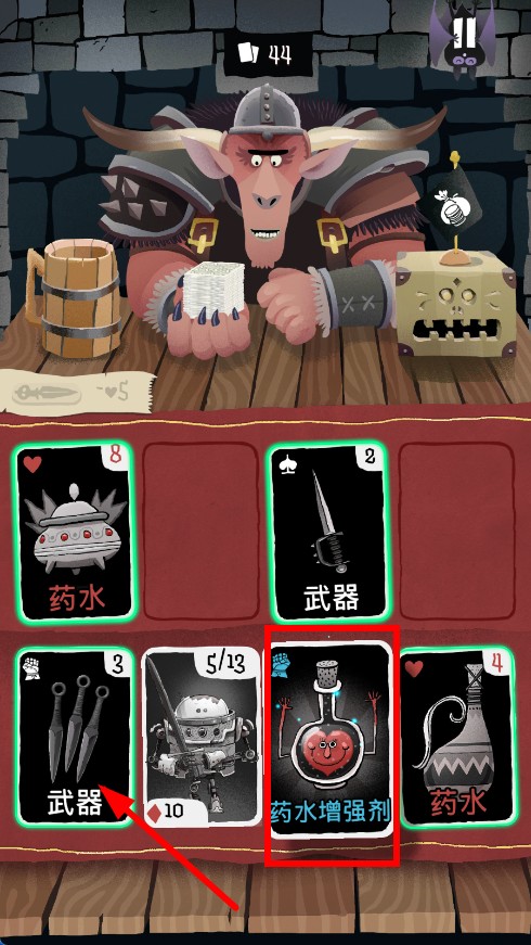1、初始從“牛魔王”手中獲得4張牌,每輪獲得3張隨機(jī)卡,總共54張卡牌,通過(guò)裝備武器盾牌道具推進(jìn)冒險(xiǎn)。