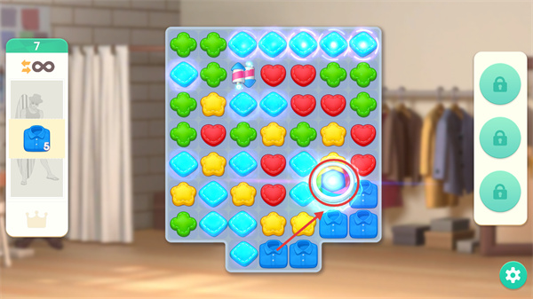2、利用【彩色陀螺】道具,大范圍消除元素,快速完成剩余藍(lán)色襯衫的消除任務(wù)。