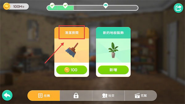 4、消耗100金幣選擇【清潔房間】,完成房間清潔任務(wù),推進(jìn)場景改造進(jìn)度。