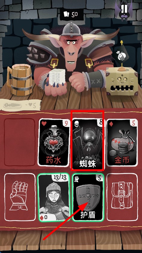 2、遇【蜘蛛】卡時,用【護盾】抵擋攻擊,擊敗獲【金幣】購新卡,搭配【藥水】增強卡組戰(zhàn)力。