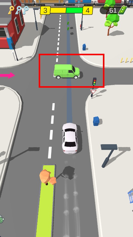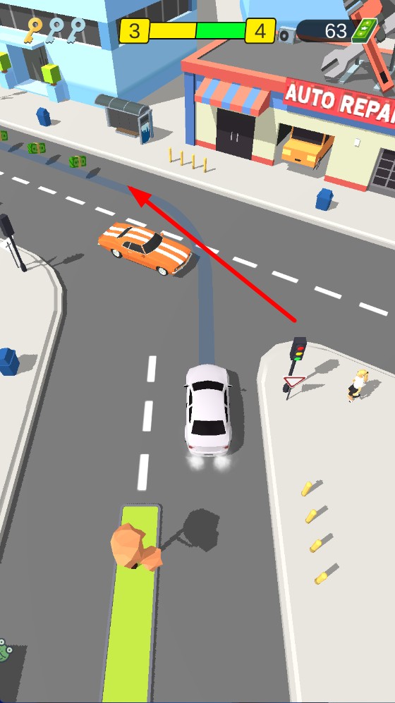 2、遇到【橙色】-【條紋】-【車】時(shí),關(guān)注其行駛軌跡,提前規(guī)劃路線進(jìn)行轉(zhuǎn)彎,同時(shí)收集道路上的【綠色】-【鈔票】,提升收益。