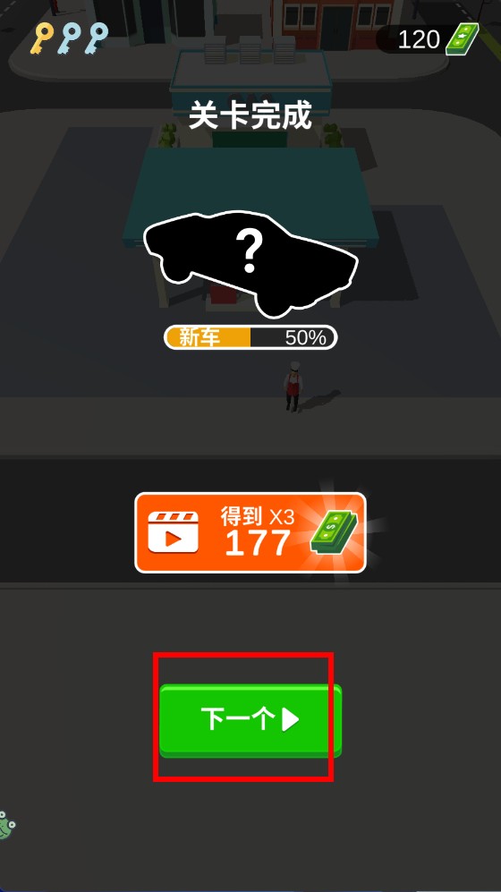 4、關(guān)卡完成后,點(diǎn)擊【綠色】-【下一個(gè)】按鈕進(jìn)入下一關(guān),也可觀看廣告獲得【177】乘3的【鈔票】獎(jiǎng)勵(lì),積累資源。