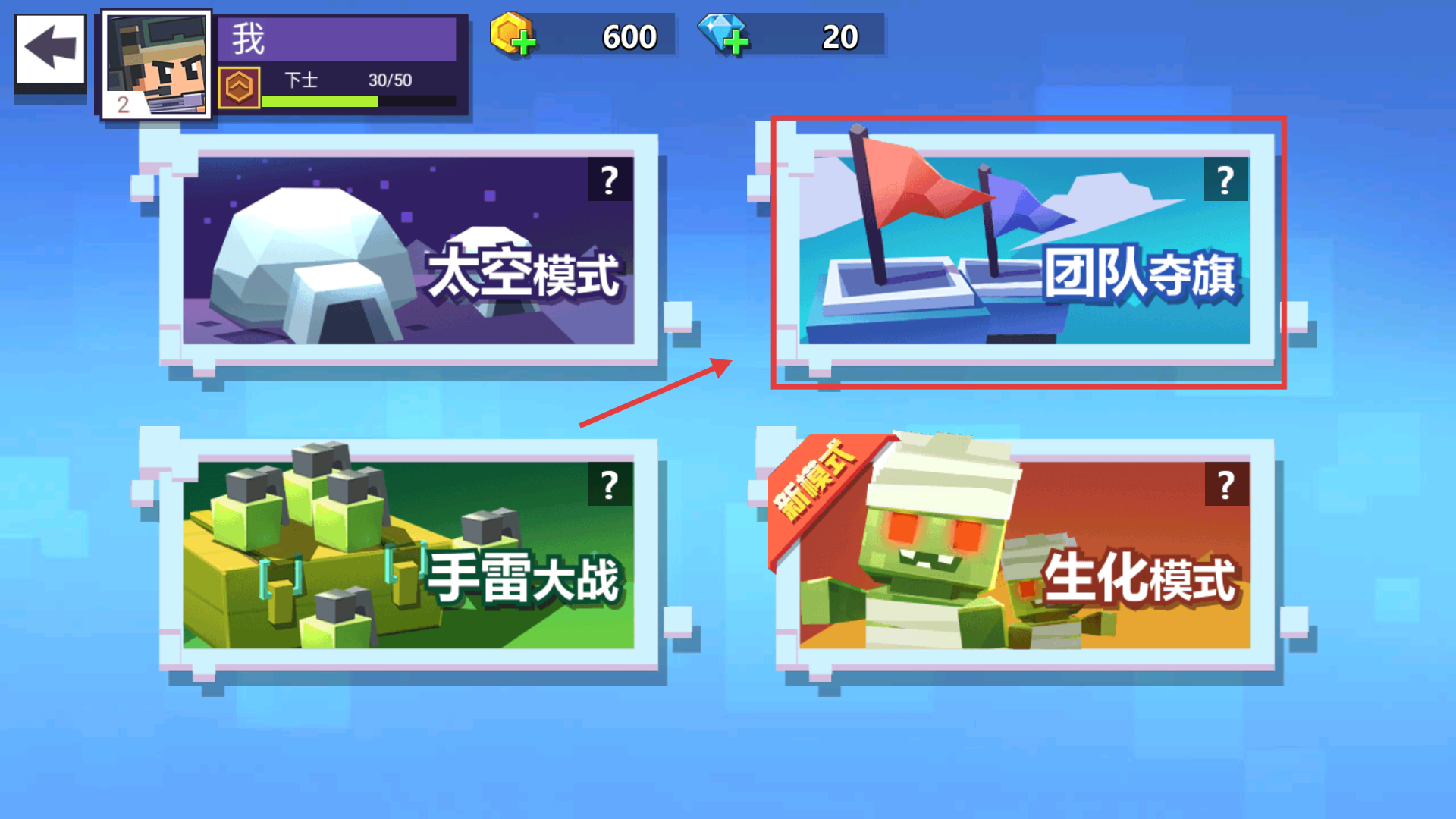 1、選擇【團隊奪旗】模式,參與團隊協(xié)作奪旗對抗,提升團隊配合能力,積累旗幟。
