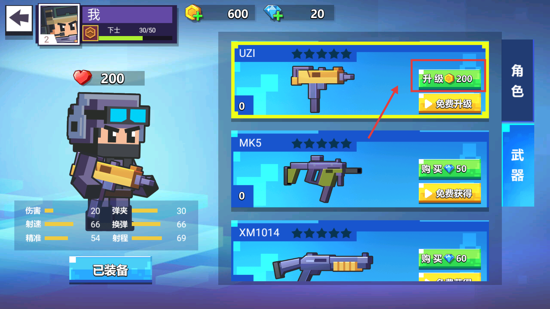 4、消耗200金幣升級【UZI】武器,提升其傷害、射速等屬性,增強戰(zhàn)斗能力,助力奪旗勝利。