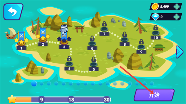 1、在游戲關(guān)卡地圖中,選擇關(guān)卡后點(diǎn)擊右下角【開始】按鈕進(jìn)入游戲關(guān)卡。