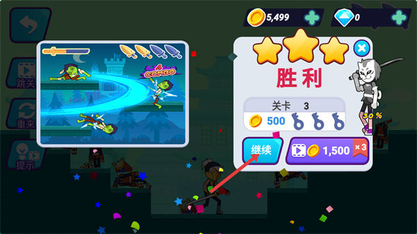 4、關(guān)卡勝利后,可獲得金幣、鑰匙等獎(jiǎng)勵(lì),點(diǎn)擊【繼續(xù)】可進(jìn)入下一關(guān)或返回關(guān)卡地圖。