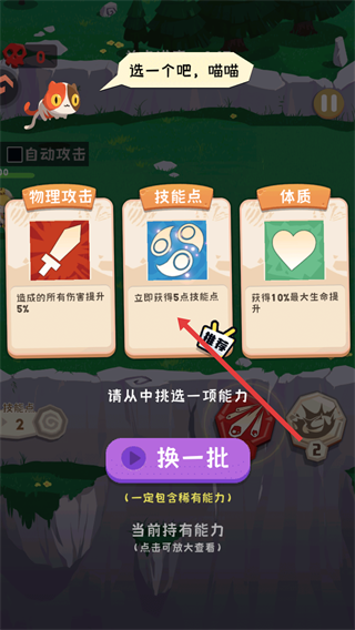 3、關(guān)卡過程中會出現(xiàn)能力選擇界面,可選擇【物理攻擊】【技能點】【體質(zhì)】等能力提升角色戰(zhàn)力,推薦選項可優(yōu)先考慮。