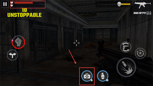 4、生命值不足時(shí),使用醫(yī)療包恢復(fù)生命,繼續(xù)戰(zhàn)斗,推進(jìn)關(guān)卡進(jìn)程。