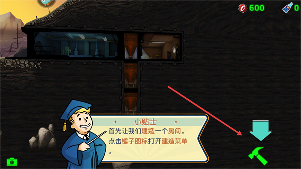 2、點(diǎn)擊錘子圖標(biāo)打開(kāi)建造菜單,開(kāi)始建造房間,為避難所的運(yùn)營(yíng)和居民生活提供基礎(chǔ)設(shè)施。