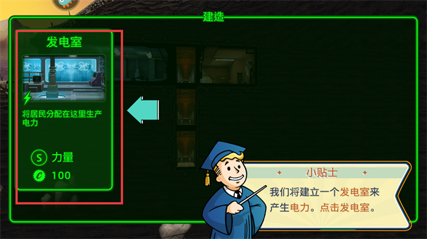 3、在建造菜單中選擇發(fā)電室,花費(fèi)100資源建造,該房間可分配居民生產(chǎn)電力,為避難所提供能源保障。