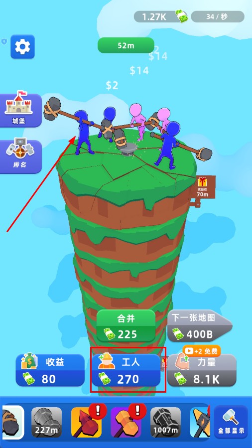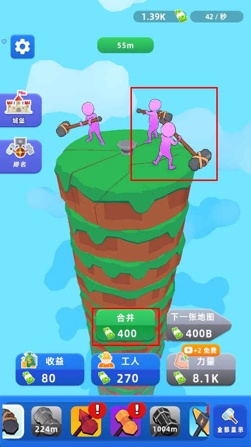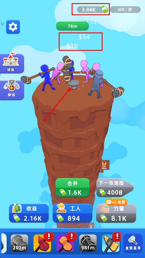 3、合并相同的小人,點擊【合并】消耗400鈔票按鈕增強(qiáng)力量,讓破壞柱子的速度變得更快。