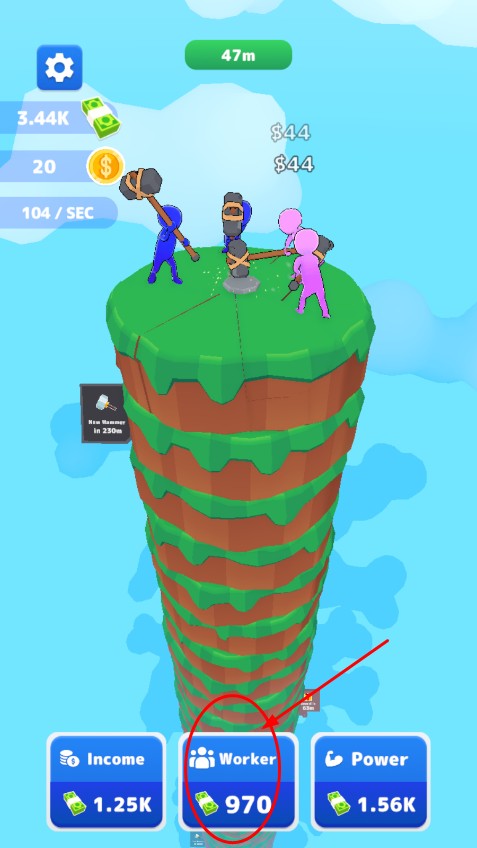2、點(diǎn)擊【W(wǎng)orker】按鈕增加砸柱角色數(shù)量,提升團(tuán)隊(duì)破壞柱子效率,讓關(guān)卡推進(jìn)速度變快。