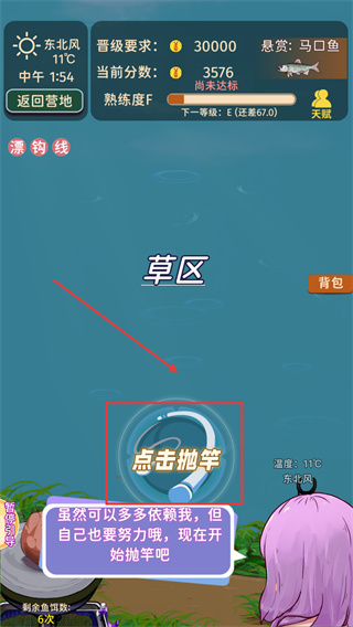 2、點(diǎn)擊【拋竿】,將魚鉤拋入指定水域,開始釣魚操作,需注意拋竿時(shí)機(jī)和位置,以提高中魚概率。