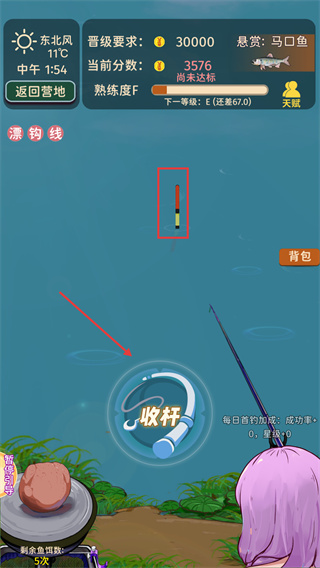 3、觀察魚漂動(dòng)態(tài),當(dāng)魚漂出現(xiàn)明顯動(dòng)靜時(shí),點(diǎn)擊【收桿】,嘗試將魚釣起,收桿時(shí)機(jī)需把握準(zhǔn)確,避免魚脫鉤。