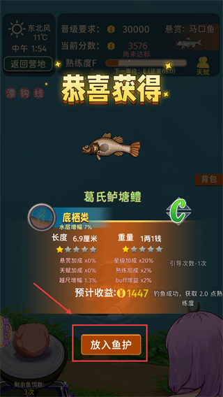 4、釣到魚后,點(diǎn)擊【放入魚護(hù)】,積累魚獲,獲取收益和熟練度,提升釣魚等級(jí),解鎖更多釣魚區(qū)域和魚種。