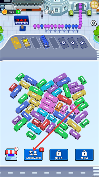 1、在游戲第2關(guān)界面,觀察排隊(duì)人物顏色,點(diǎn)擊對應(yīng)顏色的車輛,如黃色車輛,接送黃色人物。