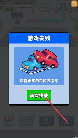 4、若游戲失敗出現(xiàn)“沒有更多的車位去停車”提示時(shí),點(diǎn)擊【再次挑戰(zhàn)】按鈕,重新開始游戲。