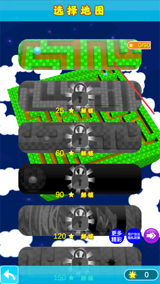2、在選擇地圖界面,優(yōu)先選擇最上方未鎖定的地圖,該地圖需收集【0/90】顆星星,完成后可解鎖后續(xù)地圖。