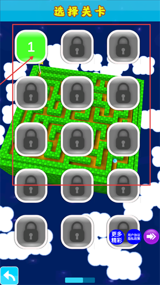 3、選擇關(guān)卡時,點(diǎn)擊標(biāo)有【1】的綠色按鈕,即可進(jìn)入第一關(guān)迷宮,其余關(guān)卡需解鎖后才能游玩。