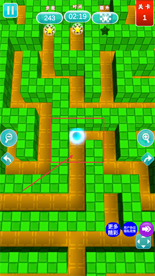 4、在迷宮中操控藍(lán)色光球移動,注意上方的【步數(shù)】【時間】和【額外】星星指標(biāo),規(guī)劃路徑以高效通關(guān)。