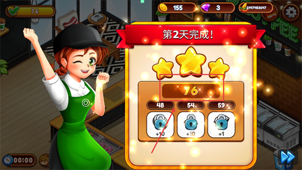 4、完成【第2天】經(jīng)營(yíng)后可獲得【76】分和三顆星評(píng)價(jià),繼續(xù)挑戰(zhàn)可解鎖更多獎(jiǎng)勵(lì)。