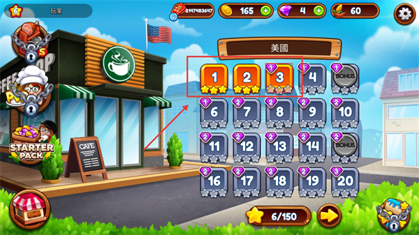 1、選擇【美國】區(qū)域的關(guān)卡,按順序選擇關(guān)卡逐步解鎖后續(xù)關(guān)卡和內(nèi)容。