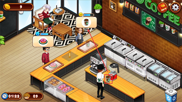 2、根據(jù)顧客需求,及時(shí)制作并交付【一杯咖啡】,注意在【01:22】時(shí)間內(nèi)高效服務(wù),同時(shí)兼顧其他顧客的點(diǎn)餐需求。