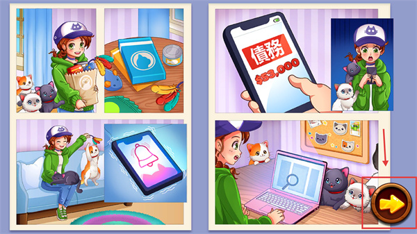 1、游戲開篇展現(xiàn)主角因貓咪相關(guān)事務(wù)背負(fù)【債務(wù)-$53,000】,需通過經(jīng)營(yíng)咖啡店來償債,點(diǎn)擊右下角箭頭可推進(jìn)劇情。