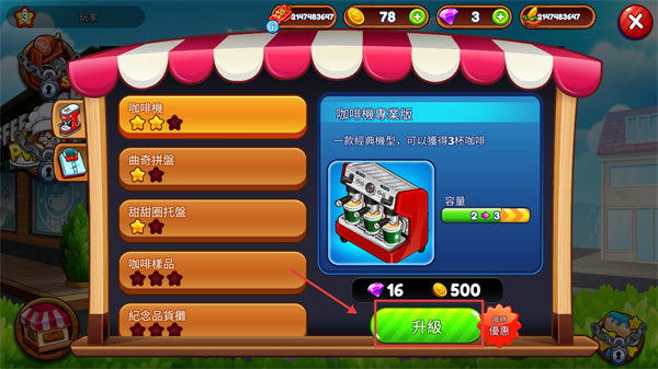 4、當(dāng)金幣和紫鉆足夠時(shí),點(diǎn)擊【升級(jí)】按鈕升級(jí)咖啡機(jī),可將咖啡機(jī)容量從2提升至3,提升咖啡制作效率以服務(wù)更多顧客。