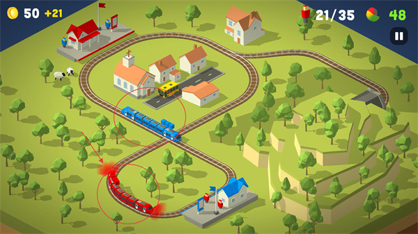 4、需同時調(diào)度多輛火車,規(guī)避相撞風險、避開違規(guī)汽車與廢棄鐵軌,考驗多線操作與時機把控能力。