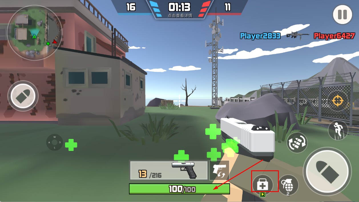 2、血量不足時(shí),點(diǎn)擊【醫(yī)療包】道具,恢復(fù)血量至【100/100】,繼續(xù)戰(zhàn)斗。