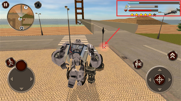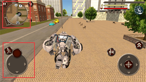 1、通過左側(cè)虛擬搖桿控制機(jī)器人移動(dòng),利用左上角小地圖查看任務(wù)點(diǎn)與敵人位置,規(guī)劃行進(jìn)路線,高效探索城市場(chǎng)景。