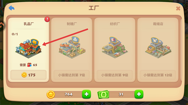 1、攢夠175金幣和65人口,便可在工廠界面選擇建造【乳品廠】呢。
