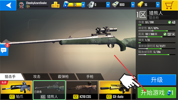 1、裝備【獵熊人】狙擊槍?zhuān)c(diǎn)擊“開(kāi)始游戲”,進(jìn)入狙擊任務(wù),利用該槍的屬性提升作戰(zhàn)效率。