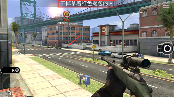 2、進(jìn)入任務(wù)場(chǎng)景,目標(biāo)為“干掉拿著紅色提包的人”,觀察城市場(chǎng)景布局,定位目標(biāo)人物位置。