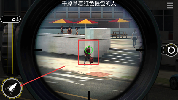 3、將瞄準(zhǔn)鏡放大至5X,精準(zhǔn)瞄準(zhǔn)拿紅色提包人物的頭部,確保一擊命中,完成任務(wù)目標(biāo)。